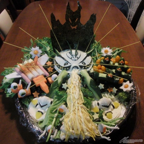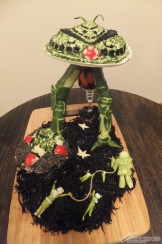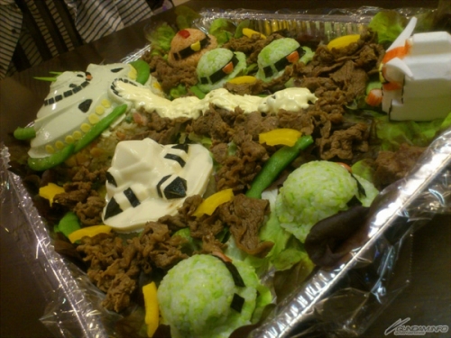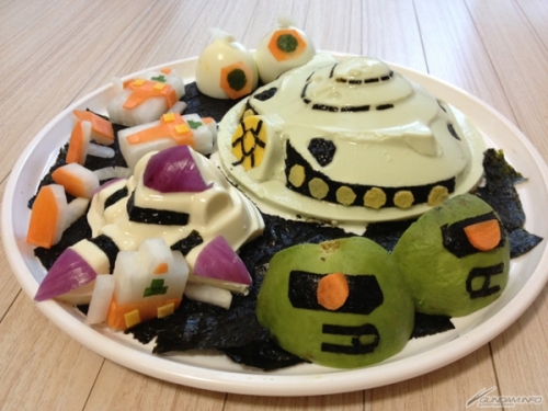 妻子を脱出させ時間稼ぎのために特攻するドズル・ザビと、スレッガー中尉の最期の場面を再現しました。プチトマトの爆風の中、キュウリで作ったドム4機を率いて、錦糸卵とポテトサラダの大型メガ粒子砲と全方位メガ粒子砲を発射するビグ・ザム。