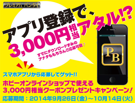 キャンペーンは、プレミアムバンダイ公式アプリをダウンロードしてマイコレクション設定で「ホビーオンラインショップ」を“ON”にし、キャンペーンバナーから応募すると、抽選で300名に「ホビーオンラインショップ」で使用可能な3,000円相当のクーポンがプレゼントされるというもの。