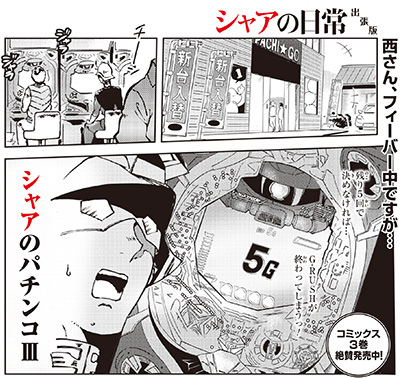 「シャアの日常 出張版」は、コミックス3巻の発売を記念したコラボ企画で、主人公の西(シャア?)がパチンコにチャレンジするというもの。