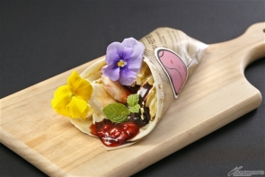 ■いちご、バナナ、ホイップ、チョコレートソースがトルティーヤで綺麗に合わさった春爛漫のワンハンドスイーツ。