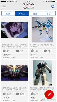 アプリ内で提供される写真や映像のシーンに対して、コメントを付けて投稿することができるほか、自分で撮ったガンダム写真を投稿できるので、ファン同士でコメントしあって盛り上がることが可能。