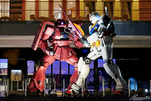 往年のライバル「ガンダム」と「シャア専用ザク」が切り結ぶ様子をイメージしたモニュメントは、ガンプラを参考に設計されており、随所に新規デザインのマーキングが施されている。全高約5mという大迫力のスケールに加えて、夜間にはライトアップも行われるなど、見るものを楽しませてくれる。