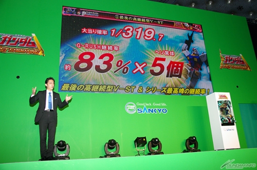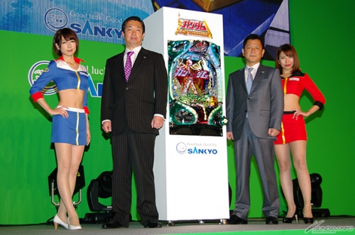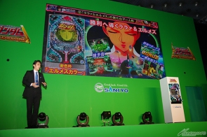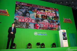 まずはじめに、株式会社SANKYO取締役専務執行役員・富山一郎氏より挨拶があり、本機は従来のパチンコファンが安心して楽しめることに重点を置いたもので、参加人口や平均稼働を増やすことで市場の活性化を図り、パチンコ業界全体の業績をV字回復させることを目指すとのことだ。