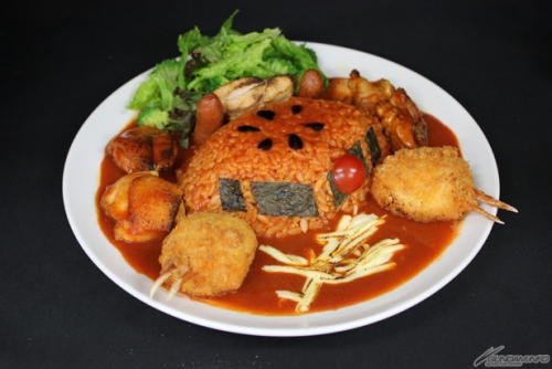 ズゴックの爪をモチーフにしたカニ爪のクリーミーコロッケなどトッピングもたっぷり入ったボリューム満点レッドカレー。