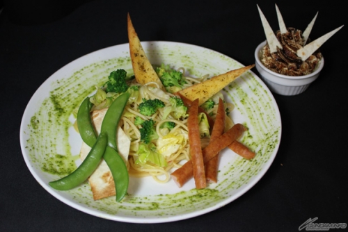 ユニコーンガンダム覚醒モードをモチーフにしたキャベツとブロッコリーのペペロンチーノ。「バンシィ」をモチーフにしたマスカルポーネのティラミス風プチデザート付。