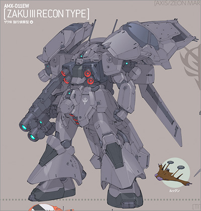 本機は、アクシズとジオンマーズが共同で開発・運用したザクIIIの偵察仕様機。強力な戦闘力は持たないものの、偵察や索敵という戦術上、必要不可欠な任務を担う。