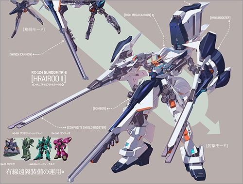 電撃ホビーウェブでは、好評連載中のコミック「A.O.Z Re-Boot ガンダム・インレ -くろうさぎのみた夢-」と連動した藤岡建機氏の描き下ろしイラスト企画にて、「RX-124 ガンダムTR-6[フライルーII]」のイラストが公開された。