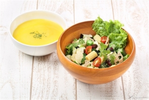 【左】3丁目のごほうびサラダ ~たっぷり夏野菜のチョップドサラダ 冷製スープ付き~