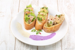 【右】ぜいたくニャラルケッタ ~えびアボカド、スモークサーモン、帆立きのこのブルスケッタ~