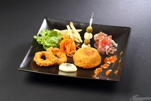【右】会戦前夜の路地裏にて~トマト&バジルのライスコロッケ・イカリングフライ・生ハム・オリーブとチーズのピンチョス~ 価格:1,080円(税込)