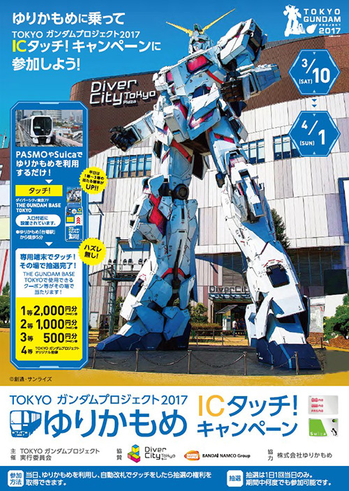 キャンペーンは、PASMOやSuicaなど交通系ICカードでゆりかもめを利用し、ダイバーシティ東京 プラザ 7Fにあるガンプラ総合施設「ガンダムベース東京」入口付近に設置された専用端末にタッチすると、ガンダムベース東京で使えるクーポンなどがその場で当たるというもの。