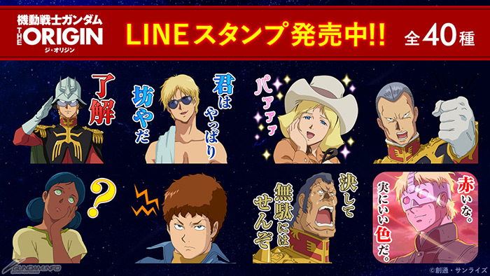 コミュニケーションアプリ「LINE」内スタンプショップにて、『機動戦士ガンダム THE ORIGIN』のスタンプが好評配信中だ。価格は、全40種1セット100LINEコイン(税込み240円)。