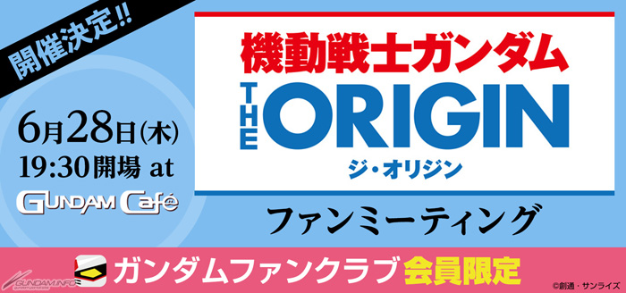 ガンダム公式カフェ「ガンダムカフェ 秋葉原店」では、『機動戦士ガンダム THE ORIGIN』のファンミーティングが、6月28日(木)に開催されることが決定した。