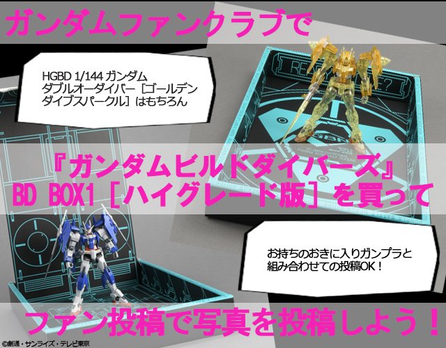 - 開催期間中に、「GFC会員限定配送用段ボール」と「ガンダムビルドダイバーズ Blu-ray BOX1[ハイグレード版]」に同梱されている限定ガンプラ「HGBD 1/144 ガンダムダブルオーダイバー[ゴールデンダイブスパークル]」や、皆様のご自慢のガンプラと組み合わせた写真を、GFCに投稿してください。