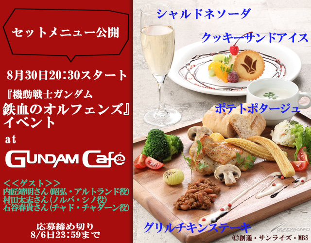 公式ファンクラブアプリ「ガンダムファンクラブ」では、8月30日(木)に開催される『機動戦士ガンダム 鉄血のオルフェンズ』イベントにて提供されるメニューが、本日公開された。