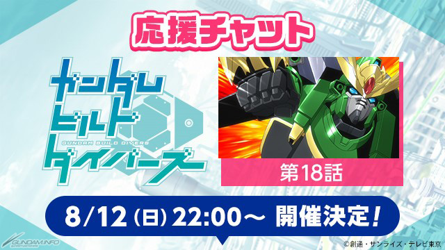 公式ファンクラブアプリ「ガンダムファンクラブ」にて、『ガンダムビルドダイバーズ』第18話応援チャットが、8月12日(日)22:00より開催されることが決定した。