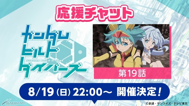 公式ファンクラブアプリ「ガンダムファンクラブ」にて、『ガンダムビルドダイバーズ』第19話応援チャットが、8月19日(日)22:00より開催されることが決定した。