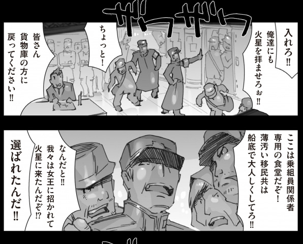 ▲移民たちの疲労もピークに達し、乗組員の間でいさかいが生じる状況に……。