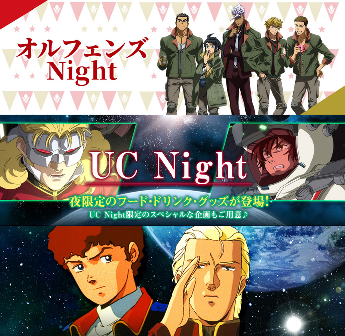「オルフェンズNight」は、大阪の「ガンダムスクエア」が2019年1月2日(水)から、「ガンダムカフェ」秋葉原店が2019年1月3日(木)からスタート。「UC Night」は2019年1月6日(日)から、「逆襲のシャアNight」は2019年1月15日(火)から各店舗にてスタートする。