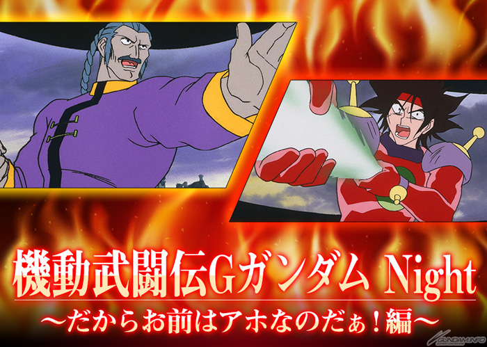 ガンダム公式カフェ「ガンダムカフェ」秋葉原店と大阪道頓堀店、大阪の「ガンダムスクエア」にて、6月25日(火)から開催される「Gガンダム Night~だからお前はアホなのだぁ!編~」では、限定予約メニューと特典ポスター、ノベルティの場面写ブロマイドが公開された。