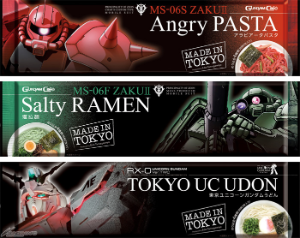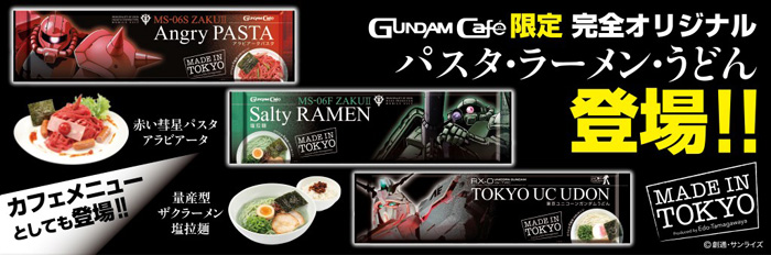お土産麺は、シャア専用ザクをイメージしたアラビアータパスタ「MS-06S ZAKU II Angry PASTA」、ザクをイメージした塩ラーメン「MS-06F ZAKU II Salty RAMEN」、実物大ユニコーンガンダム立像をイメージしたうどん「RX-O UNICORN GUNDAM Ver. TWC TOKYO UC UDON」の3種がラインナップ。価格は各400円(税抜)。