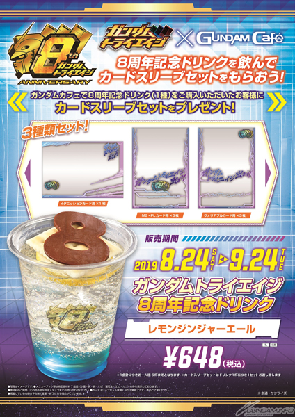ガンダム公式カフェ「ガンダムカフェ」各店、大阪の「ガンダムスクエア」では、8月24日(土)より、好評稼働中のデジタルカードゲーム「ガンダムトライエイジ」の8周年記念ドリンクが登場する。