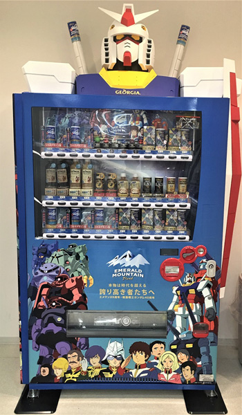 缶コーヒー「ジョージア エメラルドマウンテンブレンド」と『機動戦士ガンダム』とがコラボレーションした「自動販売機型ガンダム」が、東京・秋葉原ラジオ会館10階に設置中だ。