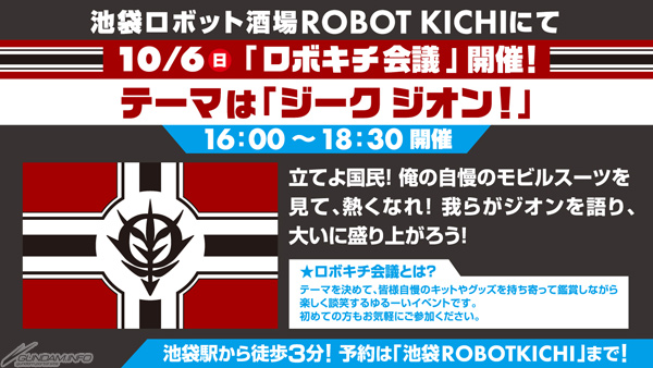 映像とロボットを眺めながら楽しくお酒と食事が楽しめる居酒屋「ROBOT KICHI」では、10月6日(日)に「ロボキチ会議『ジーク ジオン!』」の開催が決定した。