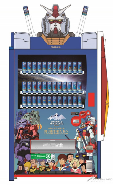 「自動販売機型ガンダム」では、本コラボによる「コラボデザイン缶」が購入できるほか、購入時に「こいつ、うまいぞ!」、「見せてもらおうか、エメラルドマウンテン豆の性能とやらを」など、アムロやシャアの名言とコラボしたこの自動販売機専用のオリジナルボイスを聞くことができる。オリジナルボイスは、アムロ5種類、シャア5種類の合計10種類で展開。