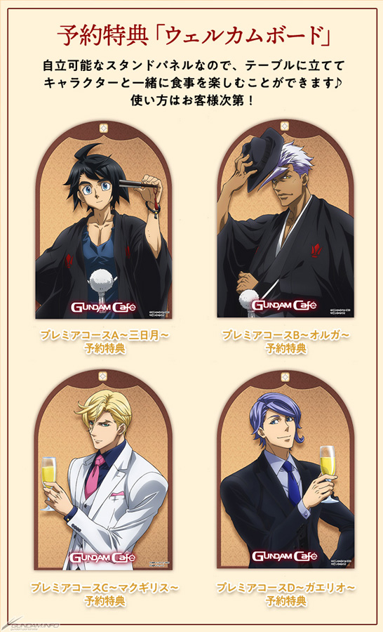 限定予約メニューには、「プレミアコース」と「スタンダードコース」が登場し、いずれも「三日月」、「オルガ」、「マクギリス」、「ガエリオ」をモチーフにしたの4種類のメニューがラインナップ。