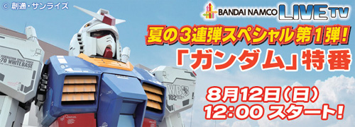 バンダイナムコグループの最新エンタメ情報をお届けする「バンダイナムコライブTV」は、夏の3連弾スペシャル第1弾として、ガンダム特番「夏のガンダム祭り」を、8月12日(日)12:00よりライブ配信する。