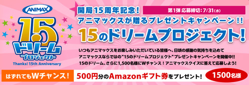 アニメ専門チャンネル「アニマックス」では、開局15周年を記念したキャンペーン「アニマックスが贈る15のドリームプロジェクト」の第1弾がスタートした。