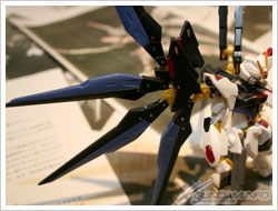 実は設定そのままでアニメーション的に展開させると一番上のウイング基部のスラスターブロック部分が頭上で干渉してしまうんですね。アニメーションの作画ではなんとかごまかしてしまうんですが、これはMGのときに対処しきれなかった所で、今回は別ブロックにして可動させるなどのアイデアで対応してもらいました。これでアニメーションのように綺麗な放射状にウイングを展開する事ができるようになりました。
