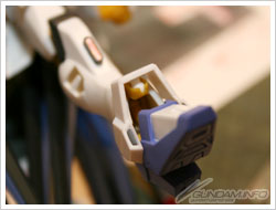 ビームライフルのメタリック表現も、連結のロングライフルにして構えさせた時に目が行くポイントとしてアピールの強いイメージを狙っています。このメタリック塗装は商品の差別化という面でもチャレンジしたところです。こういうアプローチの商品があってもいいんじゃないだろうかと。アニメーション本編の色のイメージではなく、雑誌やポスター、パッケージなどの版権イラストのような大人っぽい表現、ライティングを意識した色と解釈してもらえるといいんじゃないでしょうか。