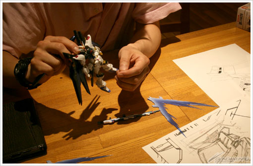 「MG ストライクフリーダムガンダム」のときはガンプラのアドバイス作業が初めてだったため、バンダイさんも私もどういった方法がいいのか分からなくて打ち合わせ時に口頭でのアドバイスのみで作業を進める、といった具合でした。下手にイメージ画を描いたり、門外漢なのに図面に細かく指示や数字を入れてしまって、立体化の際にイメージの縛りがキツクなってしまっては逆効果になりはしないかと思い、監修図面等は一切描かなかったんですね。