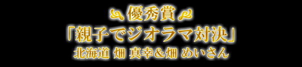 2つのジオラマを合わせると、1つの対決シーンが完成するというアイディアも非常にユニークで、このジオラマと同じように、親子が良きライバルとなっているのではと感じられました。 ぜひ親子で腕前を高めあって、もっともっとすごい作品を作ってくれることを、期待しています。