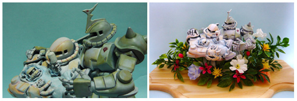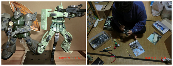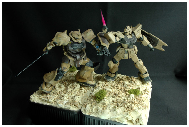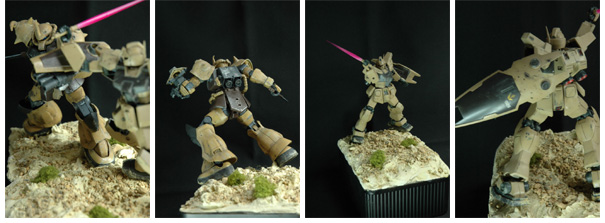 2011年の8月から親子でガンプラを始め、最初は素組で満足していましたが、息子が塗装やダメージ表現にこだわるようになり、仕上げたはじめてのザクです。ザク1体の腕が無いのは、制作途中でパーツが折れてしまい、苦肉の策として破壊された設定にしたためです。息子の別のプラモデルのパーツ等を流用してつくりました。本体だけでなく、ジオラマも制作し、戦闘シーンも再現しています。