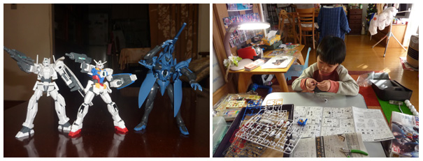 私の影響で次男(勘太・8歳)、甥(陸・9歳)も楽しくガンプラにハマっています。HPで企画を知り元旦に買ったガンプラでの応募です。写真中のストライク、フリーダム、クシャトリヤは子ども達の作品です。製作にあたって微妙な所もありますが、あえて私は手をかさず2人で仕上げさせてみました。小学2年、3年ですがなかなかの感じだと思います。PS:RGは私が作ってみました。