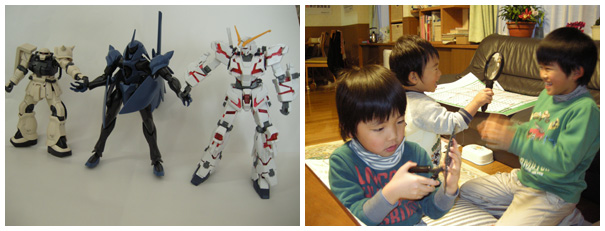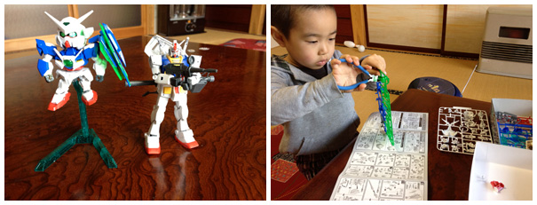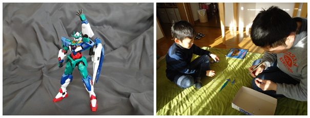 ガンプラはサンタさんとおばあちゃんからのプレゼントです。6歳年長の子供にとって、初めてのプラモデル組み立てでした。子供一人で説明書とにらめっこしながら、1体につき4時間ほどかかって、3体すべて組み立て完成。スミ入れは、おとうちゃん初挑戦でしたが、そこそこの出来具合。