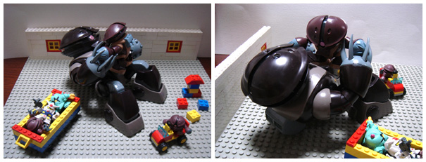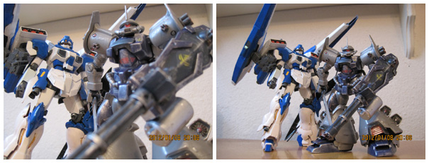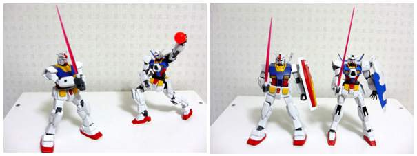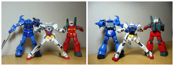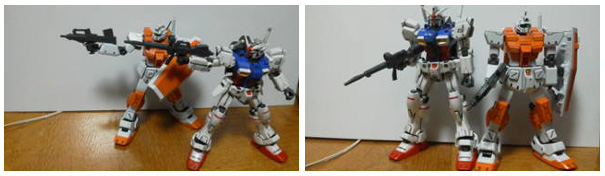 レオはガンダムAGE-1 ノーマルということでパパはそれにあわせて、ジムにしました(レオが5歳のときに初めて作ったメガサイズ ガンダムにちょこっと手を加えました)顔の部分はすこし苦労しました、レオは歌を歌いながら作っていたため、よくポリキャップをつけ忘れ、何度もはずす作業だけは手伝いました。タイトルはいまだに良いものが浮かびません。