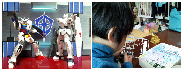 また、カメラへ向けて得意げにガンプラを向けるお兄ちゃんや、一生懸命になってAGタイタスを組み立てる弟くん、ベアッガイで顔を隠すお母さん、そして一人だけ早くアリオスを組み上げてしまって、カメラを片手に写真を撮って回るお父さんなど、写真の1枚1枚からその楽しげな情景が、ヒシヒシと伝わってきました。 皆で楽しめてよかったですね、お父さん! 我々の目からも思わず汗が…。