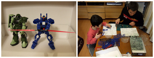 親子それぞれが好きなモビルスーツを選んで作りました。息子はやはり最新のガンダムAGE。父親(私)は、初代ガンダムをもっとも苦戦させたグフ&アムロが乗っている想定のガンキャノンを選びました。2人で妄想しながら、とても楽しい時間でした。