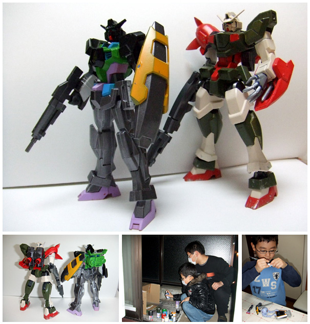 父親00(PG)、長男(MG)、次男(HG)→反抗期の髪染めなどを色変えで再現、頭部は「HG ビギニング」に差し替え、染めに失敗したのを再現(ところどころ塗っていない)。三男(HG アヴァランチエクシア)→外で遊んでボロボロになって帰ってくる様子を再現。