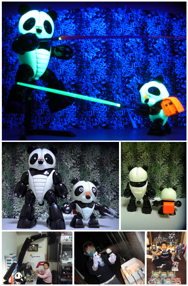 パパ=目消し、スミ入れ、パテ制作。子供=組み立て、サーフェイサー、塗装。こだわりは写真のとおり夜に光り輝くパンダです。ルミパウダーや蛍光塗料を吹きつけた発光サーベル仕様。いつもは原作に忠実なガンプラを作っている我が子が、始めて知恵を出し、笑いながら楽しく製作しました。3歳からガンダム命の我が子です。8歳になった今ではRGを素組ではなく完璧に作ります。ぜひ、御評価願います。