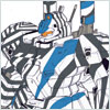 RGC-83 ジム・キャノンII (ルシアン・ベント専用機) 特徴的な迷彩パターンは一見派手に見えるが、コントラストの強い 縞模様により進行方向や移動速度を見誤らせる効果が期待できる。 中距離支援のみならず近接戦闘まで、単機であらゆる状況に 対応する必要から、左腕には格闘戦用装備が施されている。 |