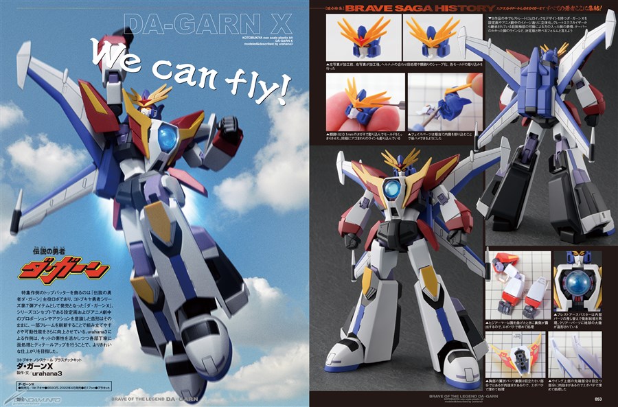 また、本特集作例のトップバッターを飾るのは『伝説の勇者ダ・ガーン』主役ロボ「ダ・ガーンX」!製作を担当したのはプロモデラーのurahana3氏。キットの素性を活かしつつ各部丁寧に面処理とディテールアップを行なうことで、よりきれいな仕上がりを目指しております。
