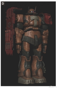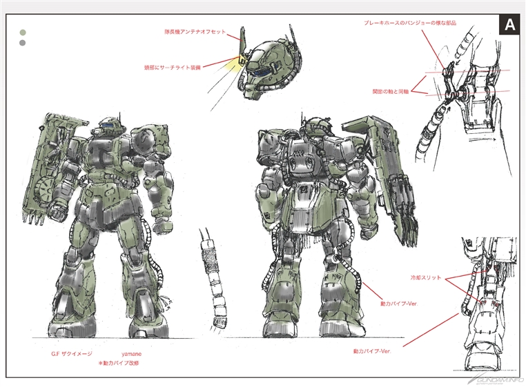 A:山根氏によるザクII F型のラフデザイン。後述するガンダムEXとは対象的な、重厚感のあるデザインになっている。テイク1では両脚外側の動力パイプが膝から離れていたが、戦闘時に木などに引っかかるという理由で、中間部分を膝に固定するデザインへと変更された