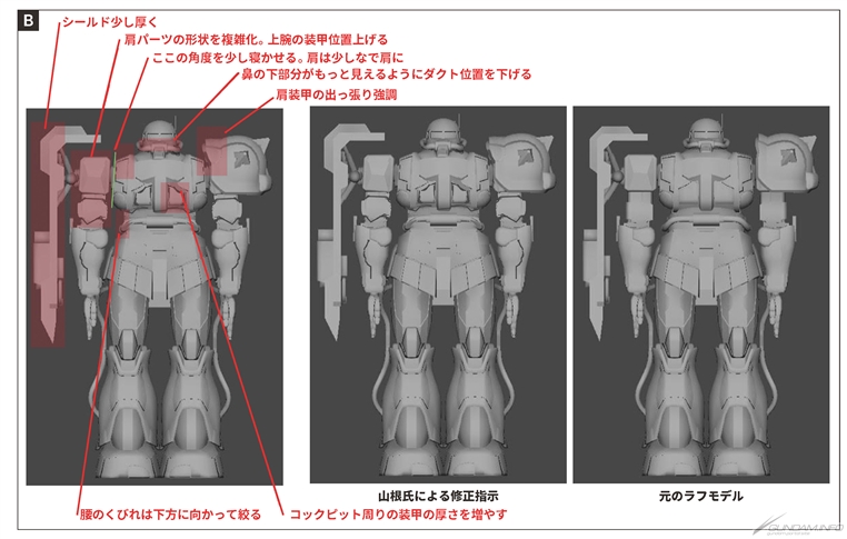 B:ラフモデルに対する、山根氏による修正指示。「体形のバランス修正に加え、細部のベベル感や、パイプのたわみ具合にいたるまで、様々な改善策を提示していただき、すごく勉強になりました」(山下氏)