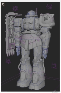 C:ザクII F型のリグ。ボーン数は370。MSのリグはザクII F型用とガンダムEX用の2種類で、グフカスタムはザクII F型のリグ、ジムはガンダムEXのリグを流用した