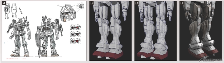 A:山根氏によるガンダムEXのラフデザイン/B:修正前、C:修正後、D:完成モデルの下肢前面。